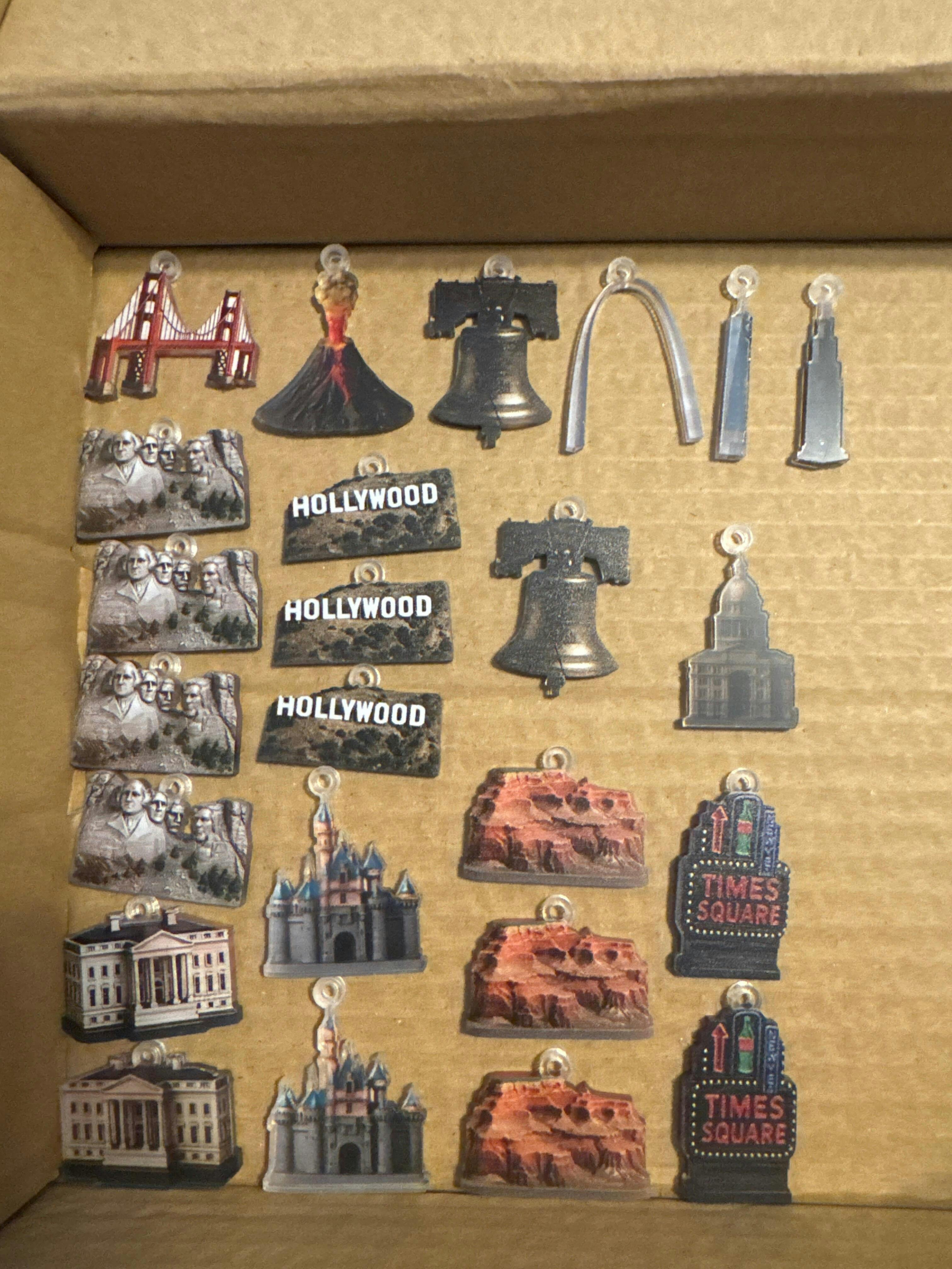 Finally arrived! What a pile of junk. They were all together in the box. I got 4 Mount Rushmore, 2 Liberty Bell, 2 Cinderella Castle, 3 Grand Canyon, 2 Times Square, 3 Hollywood signs and 1 of some others. Did not receive a bunch. Plus they are about 1 - 2” high not 7 or 11” high. Basically garbage!