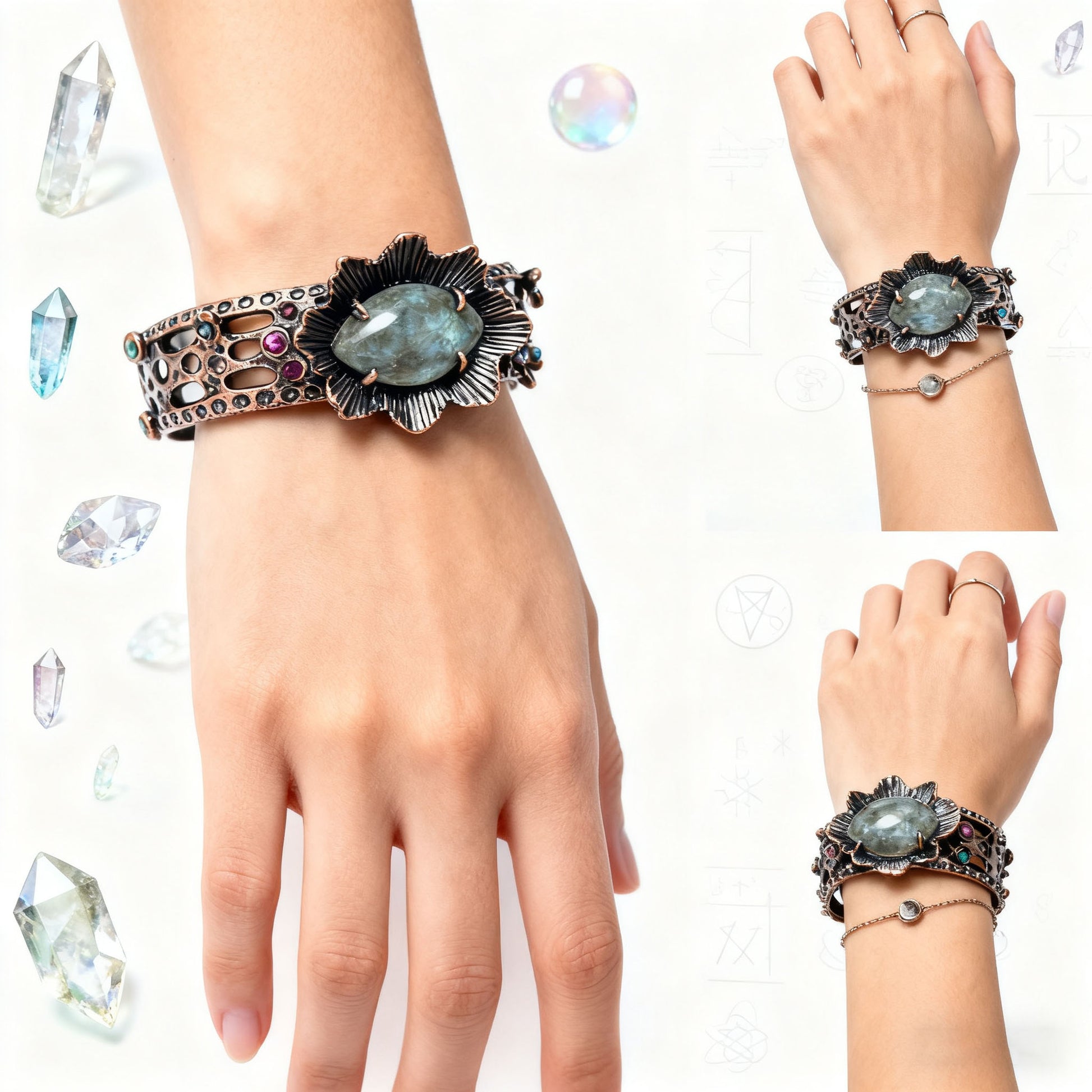 The Lunar Bloom Cuff is a handcrafted statement bracelet infused with the mystical energy of natural labradorite — a stone known to balance the mind, spark deep reflection, and attract good fortune.
